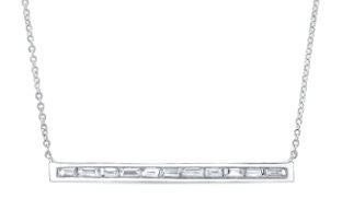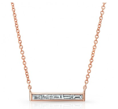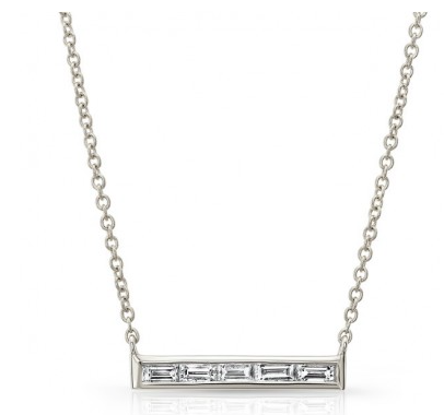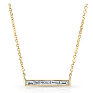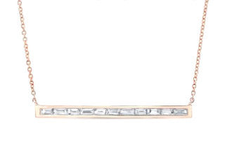 A standing baguette diamond 14k gold bar creates an elegant and sleek effect